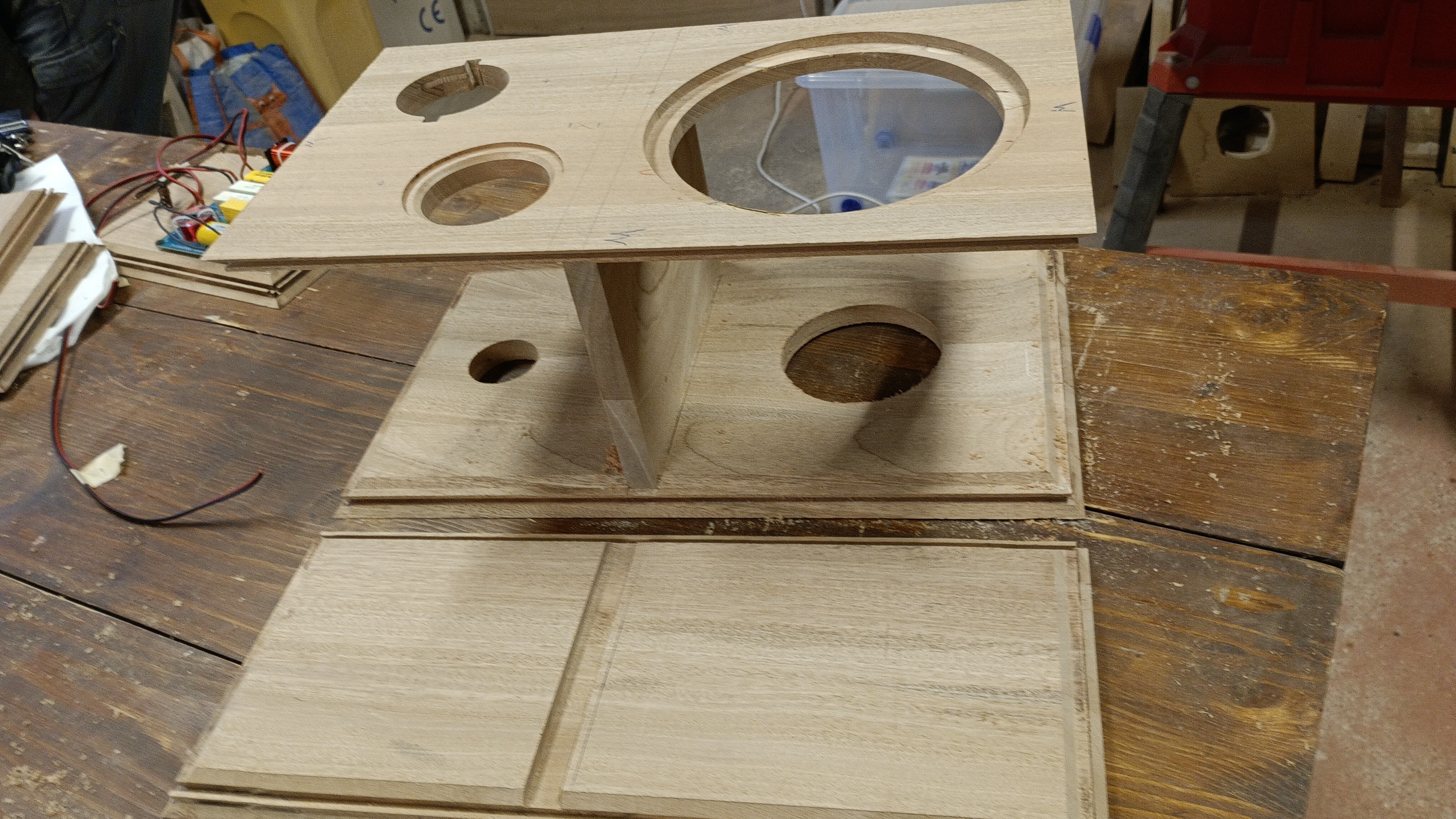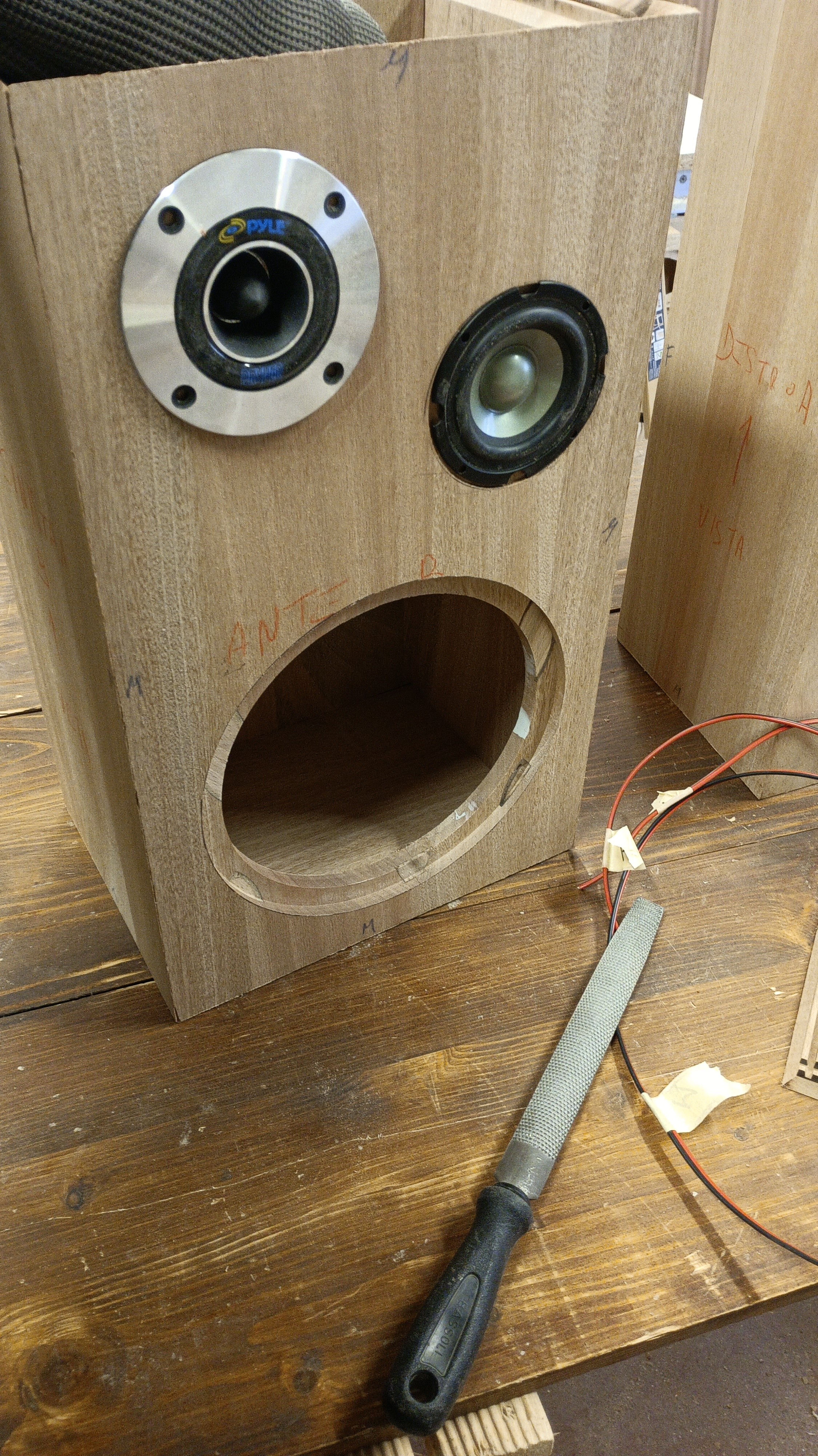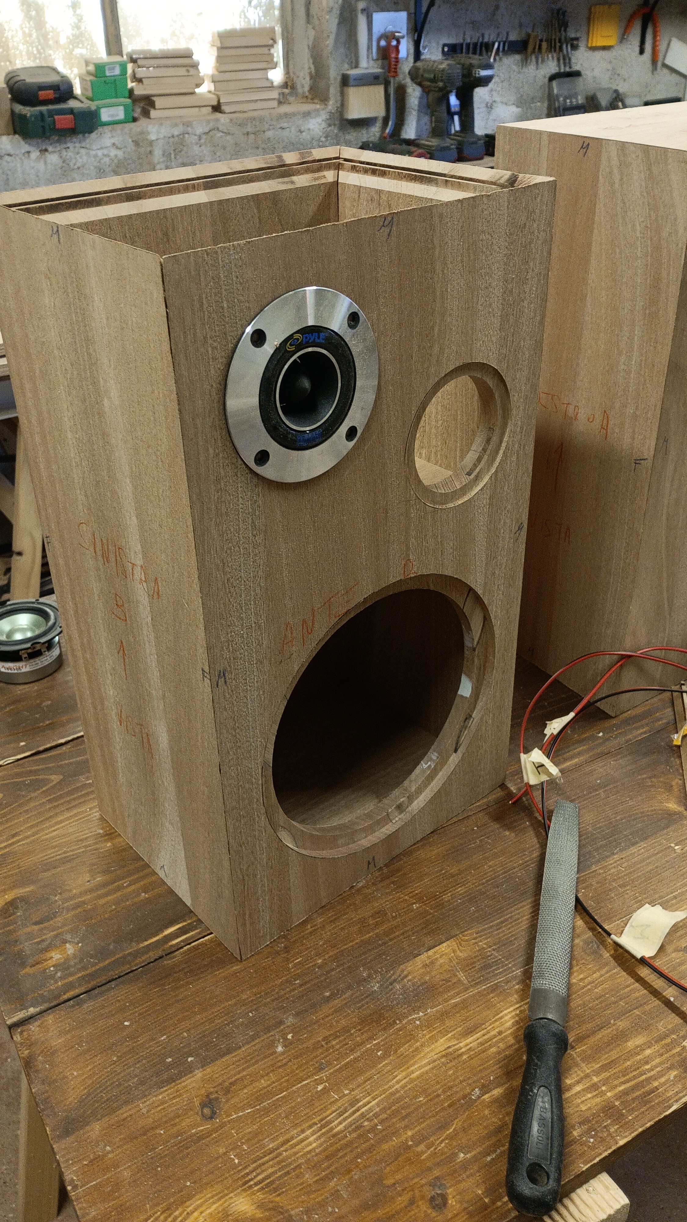 Qui possiamo notare che all' interno della cassa esiste una segregazione che mantiene il woofer isolato dagli altri altoparlanti. Questo per annullare i movimenti indesiderati del midrange, procurati con lo spostamendo d'aria prodotto da woofer stesso.